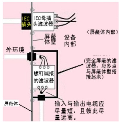 濾波器作為一種抑制傳導干擾的器件, 還應該和機殼(屏蔽體)配合使用。干擾信號的輸入端一定要在屏蔽體內部,在可能的條件下, 輸出端應接到屏蔽體的外部。這樣來自機殼內部的干擾既不會通過電源線傳導出去,又不能通過空間輻射出去。