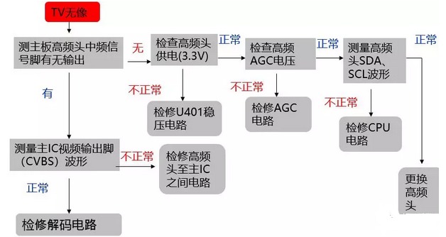 2、故障現象:TV無像。檢修流程如圖2: