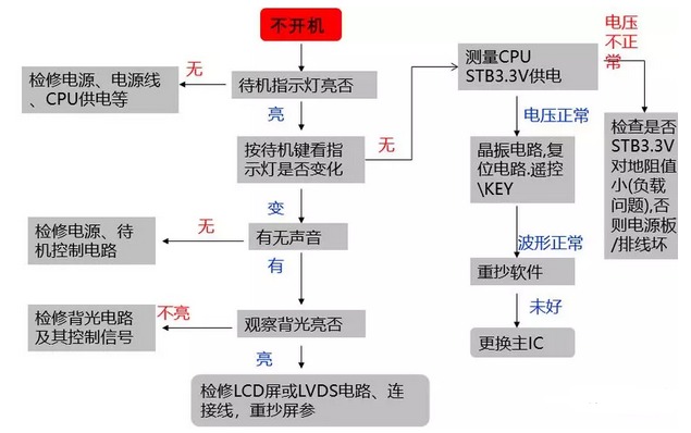 1、故障現象:不開機。檢修流程如圖1: