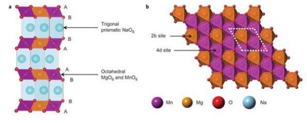 圖二, P2 型 Na2/3[Mg0.28Mn0.72]O2 材料的結構示意圖。 (Nature Chem., 2018, 10, 288–295)