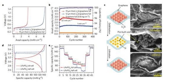 圖四, 硅鋰合金-石墨烯柔性電極的電化學性能。 (Nature Nanotech., 2017, 12, 993–999)